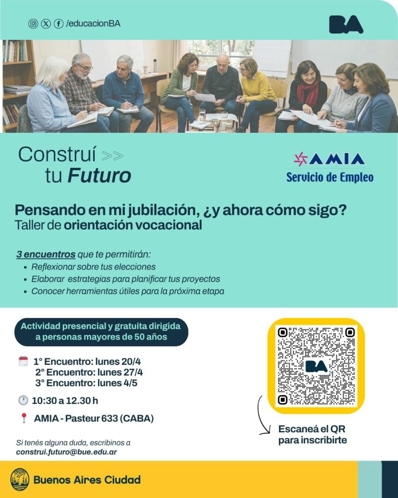 Te invitamos a participar del taller presencial de orientación vocacional «Pensando en mi jubilación, ¿y ahora cómo sigo? « organizado por el programa Construí tu Futuro perteneciente al Ministerio de Educación de la Ciudad de Buenos Aires, en articulación con el Servicio de Empleo AMIA.