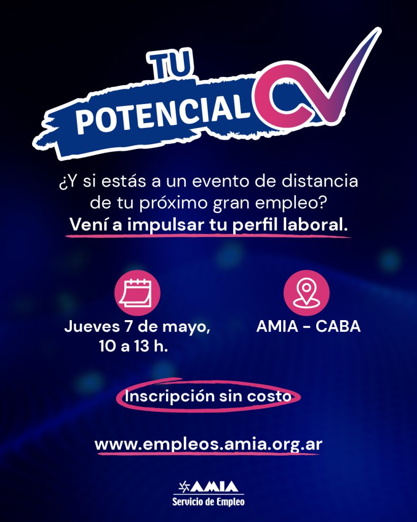 Con motivo del Día Internacional del Trabajador, el Servicio de Empleo AMIA (SEA) llevará adelante “Tu Potencial CV”, una jornada gratuita, que se realizará el jueves 7 de mayo, a las 10, en Pasteur 633, y que está destinada a personas que se encuentren en la búsqueda laboral. La propuesta incluirá un taller de orientación laboral, contenidos sobre inteligencia artificial aplicada al empleo y espacios de corrección de CV.